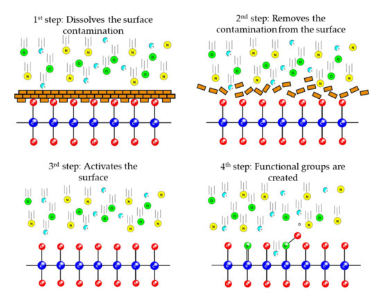 Two types of plasma are used in the industry for machining, high temperature (hot) and low temperature (cold) plasma [21]. The hot plasma is high in temperature since the plasma-forming elements are in a thermal equilibrium, so the energy of the ions, electrons, and neutral particles in the plasma is nearly the same. Thermal plasmas, for example, an argon gas plasma, can reach temperatures of 11,200 K. Further, thermal plasmas are characterized by the fact that the plasma-forming elements have a Maxwell velocity distribution or particle velocity, which means that the particles are not in continuous interaction with each other but move freely while sometimes they collide with each other [22]. For application, hot plasma is used for cutting, hazardous waste processing, coating, and spraying [23]. However, non-thermal, i.e., cold plasmas, are not in thermodynamic equilibrium because the particles contained therein do not have the same temperature and have a velocity distribution that does not correspond to the velocity distribution defined and described in the Maxwell–Boltzmann distribution [24]. In non-thermal plasmas, the ions and the neutral particles have a low temperature while the electrons have high temperatures. This, however, does not lead to a high-temperature increase, as the electrons have low density and low thermal capacity. Due to their low temperature, cold plasma is widely used in the industry. Non-thermal atmospheric plasmas are used for surface cleaning, surface activation, surface etching, and coating [25]. During these processes, two surface reactions occur primarily. One surface reaction is a physical reaction that results from ionic activation. The other is the free radical-induced chemical reaction. During the physical reaction, the particles in the plasma are ionized to give charge and kinetic energy. As these particles collide with the surface, they remove some of the atoms and molecules from the surface [26]. This bombardment increases the molecular surface roughness and facilitates the adhesion of the interface [27]. During the chemical reaction, chemically active free radicals are formed on the surface, which increases the chemical reaction potential of the surface. The efficacy of the treatment may depend on many parameters, such as plasma power density or plasma gas mixture [22]. The steps of the surface treatment are shown in Figure 1.