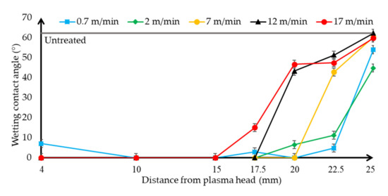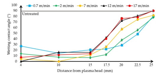Evolution and tendency of the wetting contact angle of distilled water on High Impact PolyStyrene (HIPS) specimen depending on the distance of the plasma surface treatment head, using different plasma head scanning speeds. The untreated sample’s contact angle using distilled water is shown.