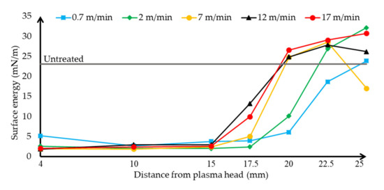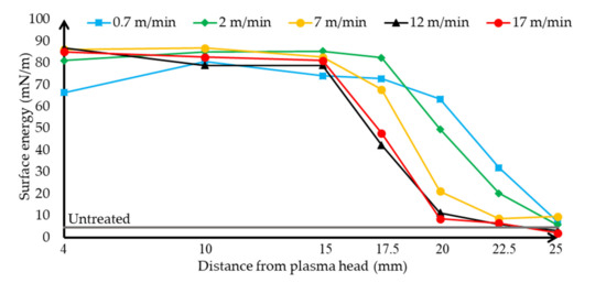 Evolution and tendency of the polar surface energy of distilled water on HIPS specimen depending on the distance of the plasma surface treatment head, using different plasma head scanning speeds. The untreated sample’s contact angle using ethylene glycol is shown.