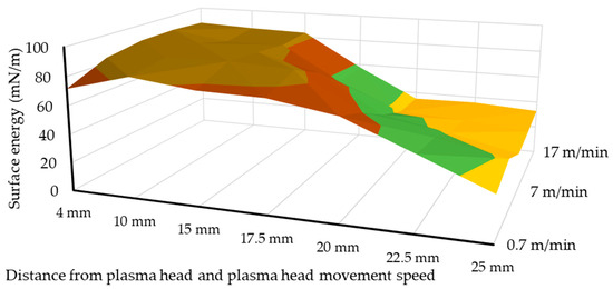 Researchers have investigated the effect of wetting change on several different polymers by different plasma surface treatments, but the wetting change result achieved by the atmospheric plasma jet with compressed air is unique in our research and its efficacy can be clearly demonstrated compared to the literature references [32]. In our case, a hydrophilic state was achieved at a significantly higher velocity of movement, i.e., using a low plasma irradiation time. Compared to typical research, the resolution detail of the parameters is also high, and thus the mapping of the interfacial energy.