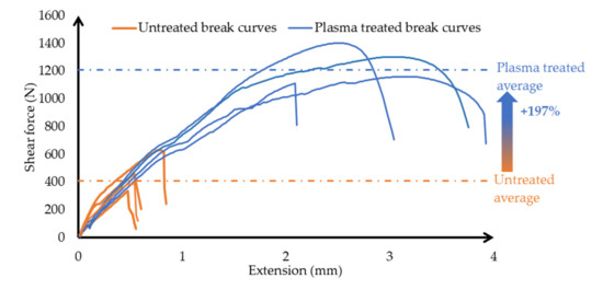 The diagram shows the breaking test of overlapping bonded joints as a function extension, indicating separately the main features of the break curves of untreated and plasma-treated samples. The dotted lines show the average breaking strength of the untreated and treated surface bonded HIPS polymer pairs, and the increment is displayed.