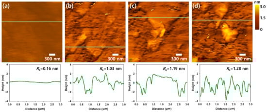 To estimate the effects of N2 and O2 plasma treatments on the surface roughness of CVD-grown graphene sheets, Tapping-mode AFM of Cu foil substrate, pristine G, N2-G and O2-G are shown in Figure 2a–c. After exposing the pristine G to N2 and O2 plasma (5 W) for 120 s, slight increases in the surface roughness were observed. The surface roughness of Cu foil substrate, pristine graphene (G), N2 plasma-treated graphene (N2-G) and O2 plasma-treated graphene (O2-G) was 0.16, 1.03, 1.19 and 1.28 nm, respectively. According to previous work on the plasma-treated graphene, the graphitic carbon clusters may be conglomerated during the plasma treatments [10,11,12]. However, since the difference in surface roughness between plasma-treated graphenes and pristine graphenes was small, it is considered that the presence of graphene itself causes an increase in surface roughness.