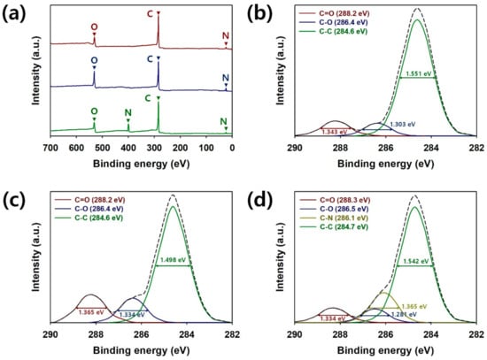 X-ray photoelectron spectroscopy (XPS) was used to further investigate chemical structures of the pristine G, N2-G and O2-G (Figure 4). Figure 4a represents the fully scanned XPS patterns of pristine G, N2-G and O2-G. The XPS spectra of pristine G and O2-G showed two peaks located at 285, 532 and 24 eV corresponding to C(1s), O(1s) and O(2s), respectively, and another peak for the N(1s) (399 eV) appeared in the spectra of N2-G [9,12,14,19]. Relative sensitivity factors (R.S.Fs) for C(1s), O(1s), O(2s) and N(1s) were 1.00, 2.93, 0.14 and 1.80, respectively. In the fully-scanned XPS spectrum of O2-G, the O content in the O2-G became higher compared with that of the pristine G. The atomic ratios of carbon to oxygen (C:O) for the pristine G and O2-G were 5.79 and 2.28, respectively. The atomic ratios of C:O and C:N for the N2-G were 6.58 and 4.80, respectively. These results indicate that the O2-plasma treatment is effective for oxygenating the surface of graphene sheets, whereas the deoxygenated surface of graphene sheets can be obtained through the N2-plasma treatment. Considering these results, both the O and N atoms have been successfully fixed on the surfaces of CVD-grown graphenes. Figure 4b–d represent the C(1s) spectra of pristine G, O2-G and N2-G. The peaks found at 284.6−284.7, 286.1, 286.4–286.5 and 288.2–288.3 eV were attributed to C−C, C−N, C−O and C=O bonds, respectively. Full width at half maximum (FWHM) values for C−C, C−N, C−O and C=O bonds in the C(1s) spectra were 1.498–1.551, 1.365, 1.281–1.334 and 1.334–1.365 eV, respectively. Pristine G had three major peaks at 284.6, 286.4 and 288.2 eV, corresponding to C−C, C−O and C=O, respectively (Figure 4b) [9,19]. The presences of oxygenated functional groups, such as C−O and C=O can be ascribed to the residues of PMMA or acetones. However, these C−O and C=O can be also found in the XPS spectra of pure CVD graphene shown in the previous studies. Furthermore, no characteristic peak for C=O was found in the Raman spectra of pristine G, O2-G and N2-G. Given these facts, the C−O and C=O peaks found in the spectrum of pristine G do not guarantee that the residues of PMMA or acetone still remain in the pristine G. After O2 plasma treatment of the CVD-grown graphene sheets, the peak intensities of C−O and C=O in the C(1s) spectrum were strengthened (Figure 4c). This indicates that more oxygenated functionalities were formed on the surfaces of O2-G sheets [9,19]. Peak intensities for C−O and C=O bonds were slightly weakened after the N2-plasma treatment, which is consistent with the fully scanned XPS pattern of N2-G (Figure 4d). This suggests that the N2 molecules can partially deoxygenate the graphene surfaces [12,14,19]. Accordingly, surface treatments of the CVD-grown graphenes have been appropriately carried out as intended.