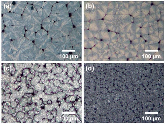 To prepare PK solution, 1.0 g of PK was added to 9 g of m-cresol solution and the PK solution was vigorously stirred for 3 h and sonicated for 1 h. The sonochemically treated solution (m-cresol: PK = 90:10 by weight) was coated on plasma-treated graphene sheets using a Meyer Rod & Air Knife Coater at 10 cm/s followed by drying at 40 °C for 10 h. These processes resulted in 10 µm-thick PK films (Figure S1, see Supplementary Materials). POM images of PKs were recorded using a Nikon Lv100 microscope (Nikon, Japan) equipped with a custom-designed T-jump cell (CU-109, Live Cell Instruments, Seoul, Korea) containing two silver (Ag) heating stages for isothermal crystallization. The PKs deposited on the plasma-treated graphene sheets were maintained on a heating stage at 280 °C for 10 min and then transferred to another heating stage to provide the desired crystalline temperature. To compare the spherulite growth rates of the samples, the samples on the second heating stage were kept at different temperatures (190, 195, 200, 205, 210 and 215 °C).