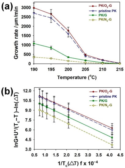 (a) Spherulite growth rate of PKs after isothermal crystallization at different temperatures. (b) Laritzen–Hoffman plots for PK/O2-G, pristine PK, PK/G and PK/N2-G.