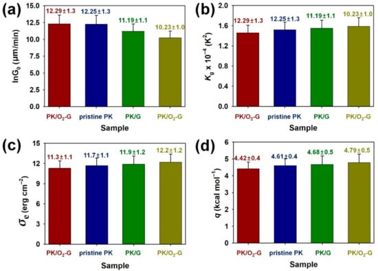 Secondary nucleation and growth parameters from spherulitic growth of PK crystals: (a) pre-exponential factor (lnG0), (b) secondary nucleation constant (Kg), (c) end surface free energy (σe) and (d) chain folding energy (q) of PK crystals.