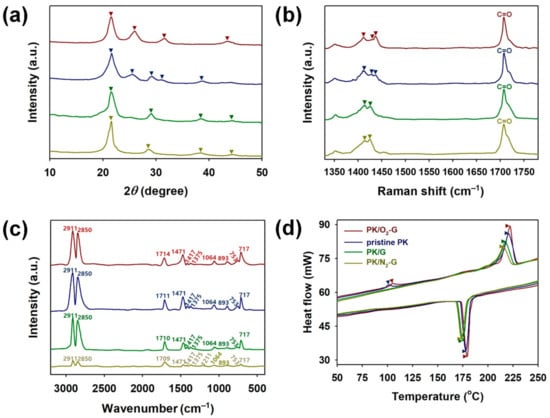 (a) XRD patterns, (b) Raman spectra, (c) FT-IR spectra and (d) DSC thermographs of PK/O2-G (red), pristine PK (blue), PK/G (green) and PK/N2-G (olive green).