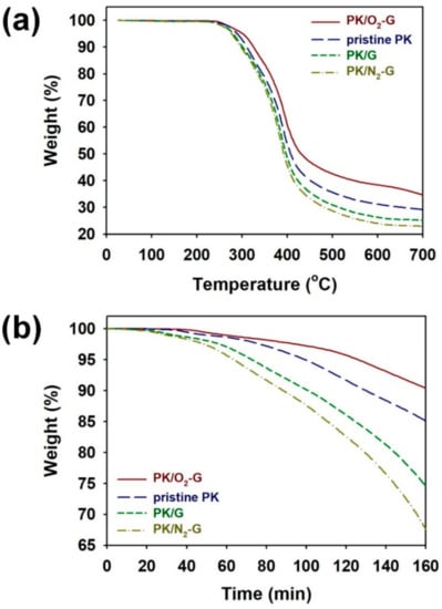 The thermal stabilities of PKs grown on the O2-G, G and N2-G sheets could be estimated by TGA curves shown in Figure 9. The weight losses at temperatures below 300 °C is due to C=O group in PK and the weight losses above 300 °C is ascribed to the decompositions of PK chains [17,23]. According to the TGA curves in Figure 9a, the weight losses below 300 °C for PK/O2-G, pristine PK, PK/G and PK/N2-G were 5.5, 7.7, 9.7 and 10.2%, respectively. Furthermore, the weight losses at 700 °C for PK/O2-G, pristine PK, PK/G and PK/N2-G were 65.5, 70.9, 74.9 and 78.1%, respectively. These results reconfirm that the thermal stabilities of PKs are highly dependent on the crystalline structures of the PKs. The thermal stability of the PKs was further studied by measuring the isothermal TGA curves (Figure 9b). The PKs were heated from 30 to 250 °C at a heating rate of 10 °C/min and the samples were maintained at 250 °C for 160 min under N2 atmosphere. After the isothermal treatment for 160 min, the residual weight (%) of PK/O2-G, pristine PK, PK/G and PK/N2-G were 90.5, 85.0, 74.7 and 68.1, respectively. Thus, the thermal stability of the PK was significantly enhanced by performing crystallization of PK on O2-G sheet [2,17,18].