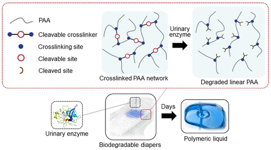 Currently, the most commonly used SAP in the industry is a crosslinked network of poly (acrylic acid) (PAA) chains [4]. It has been known that PAA chains of a molecular weight less than 1 kg/mol can be degraded in sewage by soil microorganisms [5]. Therefore, a design principle in creating a biodegradable SAP is first to degrade a crosslinked PAA network into linear PAA chains by cleaving crosslinking sites and then fragmentizing linear PAA chains into smaller pieces to be degraded by the microorganisms. Previous works have synthesized biodegradable SAP through embedding cleavable moieties into the polymer network [6]; however, these attempts had limited success due to complex synthetic routes, low production yield, and insufficient water absorbency and mechanical properties [7,8,9]. Instead of a PAA, other polymers that are charged and intrinsically biodegradable were made into SAPs via crosslinking. For example, a crosslinked network of biodegradable poly (aspartic acid) polymers was synthesized via a condensation polymerization of L-aspartic acid [10]. However, its use in the SAP industry is limited because of its weak mechanical strength and a high production cost. While most previously synthesized biodegradable SAPs contained the ester groups for hydrolytic degradation, these methods cannot apply to the current industrial SAP manufacturing process since it involves a high-temperature heating step, which accelerates hydrolytic degradation. Thus, to realize the industrial application and to enhance the long-term stability during storage, the use of a specific enzyme–substrate reaction for degradation is preferable [11].