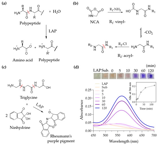 Synthesis of the end-modified LAP substrate and its biodegradability. (a) LAP catalyzes the hydrolysis of the amide bond at the N-terminus of a peptide. (b) Ring-opening polymerization of NCA is initiated by allylamine, and the N-terminus of the oligo (glycine) was modified with acryloyl chloride to become acrylamide. (c) When triglycine is cleaved by LAP, a primary amine is generated and reacts with ninhydrin to produce Rheumann’s purple pigment, which can be quantitatively measured using a spectroscopic method. (d) A photograph of purple pigments produced as a result of the triglycine cleavage by LAP at a varying incubation time (top) and the UV–Vis spectra (bottom) (inset: absorbance at 566 nm).