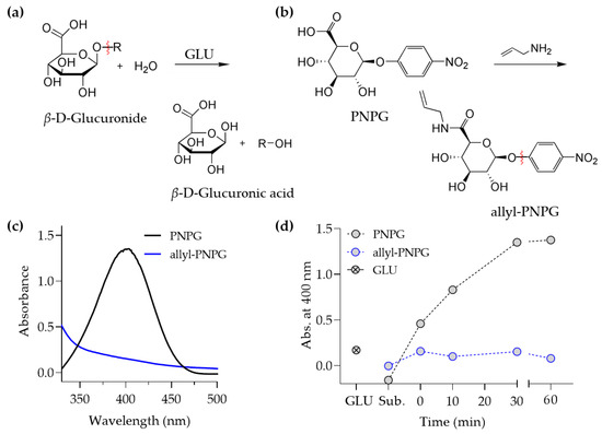 Synthesis of the allyl-substituted GLU substrate and its biodegradability. (a) GLU, a member of the glycosidase family, catalyzes the cleavage of a glycosidic bond at the non-reducing end and releases β-D-glucuronic acid from polysaccharides. (b) A modification of a carboxylic acid of PNPG with allylamine to tether the polymerizable allyl group. (c) UV–Vis spectra of PNPG and PNPG tethered with the allyl group (allyl-PNPG) after mixing with GLU for 30 min. PNPG displayed the characteristic spectrum of p-nitrophenol. (d) The absorbance was measured at 400 nm for PNPG and allyl-PNPG mixed with GLU over a varying incubation time.