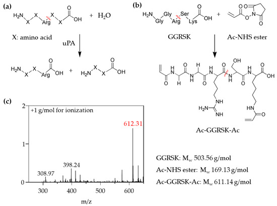 Confirming that the chemical modification of the LAP and GLU substrates with polymerizable groups prevented their biodegradation by the corresponding enzymes, we examined the uPA substrate for its biodegradability when modified with a polymerizable group. The uPA substrate is a trypsin-like protease that catalyzes plasminogen to plasmin in plasma by cleaving the peptide bond formed between the C-terminus of an arginine (Arg) residue and the N-terminus of adjacent amino acid residues (Figure 4a). Previous studies used the commercial substrates of uPA, where the C-terminus of Arg was substituted with p-nitroanilide, 4-methylcoumarin, or fluorescent dyes, which are spectroscopically detectable when released by uPA [26,27,28]. Peptides with various sequences containing Arg were examined for cleavage by uPA. For example, the X2–X1–Arg↓X1′substrate containing the fluorogenic leaving group (X1′), where X1 (Gly, Ala or Ser) and X2 (Thr or Ser) are connected to the N-terminus of Arg, was effectively degraded by uPA at the C-terminus of Arg [26]. Besides, the peptide Gly–Arg↓X, the native sequence derived from plasminogen, was more efficiently cleaved by uPA when X was Ser than Var [29].