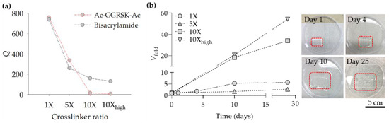 Next, we examined the SAP made of Ac–GGRSK–Ac for its biodegradability by uPA. SAP made of Ac–GGRSK–Ac and swollen in an equilibrium state was incubated in the phosphate buffered saline (PBS, 37 °C) containing uPA at 1 μM, which is similar in concentration to that found in human urine (0.3 μM) [30]. We found that the volume of SAP swollen in PBS, denoted as the fold-increase in volume Vfold increased with incubation time (Figure 5b). The SAP made with a higher molar ratio of crosslinker and irradiated with a higher UV dose showed a steeper increase of Vfold with incubation time, indicating that the crosslinker was more rapidly cleaved by uPA. After 30 days, the SAP swelled so much it became practically shapeless, indicating that the crosslinker was mostly cleaved by uPA. We infered that the time required for complete degradation can be matched to the times necessary for individual applications by adjusting the crosslinker density and the degradation kinetics of each crosslinker. In practice, the temperature and the quality of aqueous solution would affect Q [31,32], which in turn would influence the crosslinker density and degradation kinetics. Taken together, we demonstrated the creation of the biodegradable SAP using the cleavable crosslinker made of the GGRSK peptide, the substrate of uPA. As a control experiment, we created the SAP using a non-cleavable crosslinker, bisacrylamide, and found that Vfold was maintained at 1 over an extended incubation time.