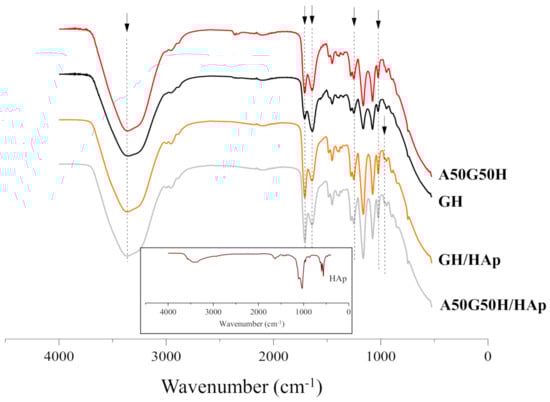 Likewise, the same phenomenon can be observed for samples containing HAp loaded in a polymeric network. The loading of hydroxyapatite caused the reduction of porosity of the hydrogel scaffolds, which is in accordance with earlier research [14,60,61,62]. The porosity decrease was more pronounced in the case of A50G50H/HAp, confirming the interaction between functional groups of alginate and HAp.