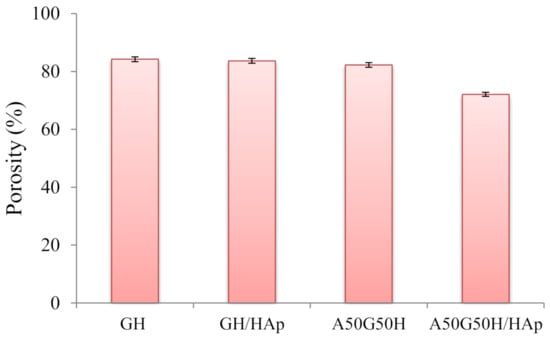 The values of porosity of the hydrogel scaffolds, calculated by Equations (1) and (2), are displayed in Figure 3. According to the obtained results, the porosity of the scaffolds varied in the range of 72.10–84.25%, depending on the chemical composition of hydrogel scaffolds. The highest porosity was shown in the GH sample. As expected, the addition of alginate in the polymeric matrix, as an interpenetrating component of the scaffold, slightly lowered the porosity. Alginate penetrated through the pores of the primary matrix, which was formed of HEMA and gelatin, and filled some of them, causing a decrease of overall porosity.