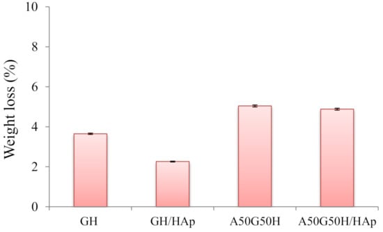 The degradation of a biomaterial aimed for tissue regeneration is a requirement for downstream cell differentiation and functional tissue integration, which determines the therapeutic outcome; thus, these materials should be able to degrade within a certain time frame [73]. Most of the degradation processes comprehend the water-induced hydrolysis, where the water, as a biological environment, enters the polymeric matrix, initiates its swelling, and triggers the formation of oligomers and monomers. Therefore, the oligomers and monomers leave the polymeric matrix, causing the decrease of weight of the polymeric biomaterial. In addition, the degradation of biopolymer presents a chain scission process, whereby the polymeric chains are cleaved and the oligomers and monomers are created [74]. An in vitro degradation study conducted for up to 3 months initially showed that scaffolds based on alginate, gelatin, and HEMA maintained their structural integrity without completely losing the original architecture and strength. The results were obtained as values of weight loss (%) of the tested samples during 3 months of the degradation study (Figure 6). According to the values of weight loss (%), the influence of the chemical composition of scaffolds is noticeable. The introduction of alginate influenced the degradation by raising it (5.04%) compared to the GH sample (3.65%). This finding could be described as a consequence of alginate leaving the polymeric matrix, considering the way of its interpenetrating incorporation. Thus, degradation behavior (weight loss) can be easily triggered by varying hydrogel scaffold composition. On the other hand, the incorporation of HAp slowed down the degradation process, so GH/HAp exhibited a weight loss of 2.26%, while A50G50H/HAp lost 4.88% of its total weight. This phenomenon could be explained by the ability of HAp to absorb water molecules and make a “shield”, which will slow down the degradation [75,76]. In addition, the agglomeration of HAp may reduce the specific area; thus, the degradation rate of the scaffolds can be reduced [77].