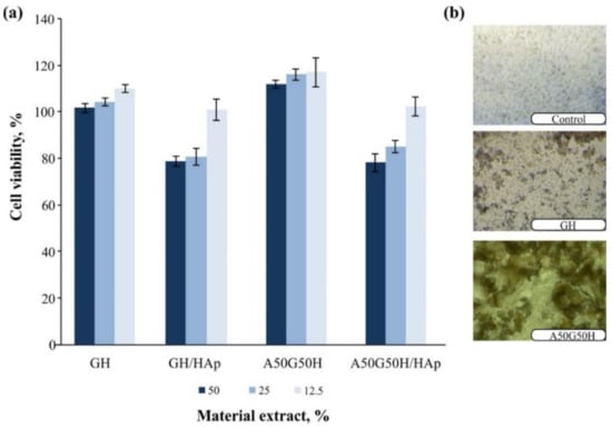 Cell viability upon treatment with extracts of AGH and AGH/HAp hydrogel scaffolds (a) and accumulation of cells on its surface (b). AGH: alginate, gelatin, and synthetic monomeric component HEMA.