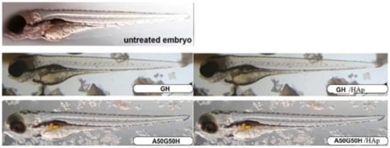 Morphology of zebrafish embryos exposed to the ground materials GH, GH/HAp, A50G50H, and A50G50H/HAp hydrogel scaffolds (200 µg/mL) at 104 hpf.