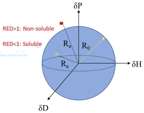 In general, solvents have absolute HSP values (with specific δP, δD, and δH values), while solutes have a sphere that indicates a spatial region of likely solubility (with a radius, R0) [16]. The HSP distance from the center of the sphere to a solvent is defined as Ra and can be calculated using Equation (1) below: