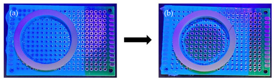 A dip coating method was used to coat the 4 cm wide × 6 cm long printed circuit boards (Figure S1). The dip coating method was selected as it is widely used in the industrial coating process to manufacture bulk products [22]. A printed circuit board was immersed perpendicularly into liquid conformal coating material and removed after one second immersion time. Then, the printed circuit board was hung to remove excess coating material and left to dry at room temperature for 48 h to ensure the coating fully dried (note: drying at room temperature for 24 h was suggested by the acrylic conformal coating manufacturer). A washer/gasket (the Home Depot, Tewksbury, MA, USA), was pasted on the conformal coating surface and a sheet of parafilm attached to the back of the printed circuit board to avoid solvent leakage during the dwell test. The test area for the solvent and coating interaction was located inside the gasket and had an area of 572 mm2. Solvent blends tested were selected to have different distances to the sphere center from one another. The solvents were blended in advance to conducting the dwell time test. The Klean Strip Premium coating stripper with DCM was poured into the gasket and covered by a lab watch glass (Fisher Scientific, Waltham, MA, USA) to prevent solvent evaporation during the dwell time test. The lab watch glass and solvent blend were removed after various dwell times (2, 3, 5, 10, and 20 min). The researchers then scraped the printed circuit board surface coated with the acrylic conformal coating. Once approximately 90% of the conformal coating was removed (confirmed using UV torch), the test was considered completed (Figure 2). The same steps were performed with solvent blends to determine the dwell times required to remove 90% of the conformal coating from the surface of the printed circuit board.