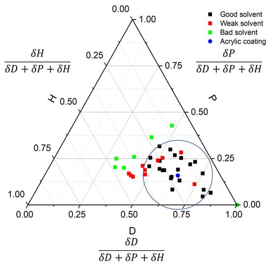 The Hansen solubility parameters (HSP) values (D = 16.5, P = 4.1, H = 5.3, with a radius of 6.8) of the acrylic coating determined by testing 39 solvents.