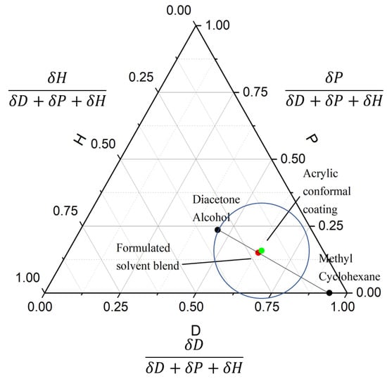 HSPs are assumed to be additive via the geometric mean rule. This means that two given solvents can be mixed in a certain ratio to form a solvent blend with an HSP value that represents the average of both ingredient solvents. This relationship is assumed to be linear such that the HSP value for a mixture of any number of solvents can be calculated given the mixture ratio and the original HSPs of each constituent solvent. Based on this, multiple solvent blends could be derived from various pure solvents to ensure anticipated solubility using HSP. Figure 4 shows an example of solvent blend identification using this method. By adjusting the volume ratio of diacetone alcohol (dwell time: 12 min) and methyl cyclohexane (cannot dissolve acrylic coating after 30 min) to 46:54, the formulated solvent blend was quite close to the center point of acrylic conformal coating solubility sphere and was found to dissolve conformal coating with a 3 min dwell time (Table S4). The two ingredients of a solvent blend do not necessarily need to be out of the solubility circle as long as the identified solvent blends provided more desirable solubility, cost, and the environment, health and safety (EHS) characteristics.