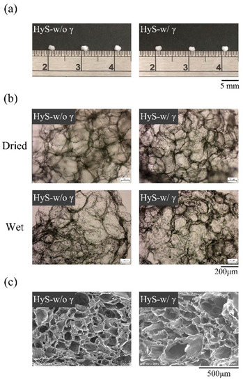 Freeze-dried hydrogel macrospheres after (HyS-w/γ) and before (HyS-w/o γ) sterilization of internal macrosphere microstructures of (a) photographs, (b) OM images, and (c) SEM images.