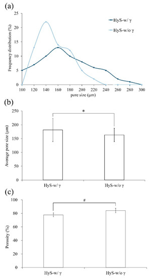 Comparisons of the (a) pore size distribution, (b) average pore size (n = 60; *: p < 0.05), and (c) porosity of hydrogel macrospheres before (HyS-w/o γ) and after (HyS-w/γ) sterilization (n = 60; #: p > 0.05).