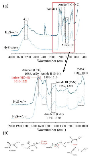 (a) Full and specific absorption bands obtained through the FTIR spectrum analysis of macrospheres before (HyS-w/o γ) and after (HyS-w/γ) sterilization. (b) Schematic of the mechanisms of amide bond decomposition into active imine or nitrile groups after irradiation, which can generate new intermolecular crosslinking sites in hydrogels.