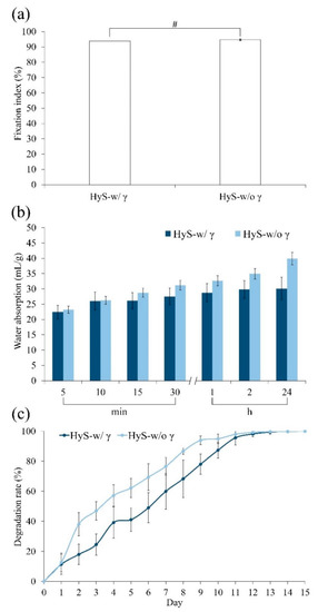 Physiochemical analysis of hydrogel macrospheres before (HyS-w/o γ) and after (HyS-w/γ) sterilization corresponds to amine fixation index (n = 6, #: p > 0.05) (a), water absorption ratio (n = 10) (b), and degradation rate (n = 10) (c).