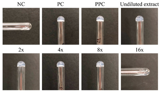 Second, the sample group was prepared by diluting 50 μL of undiluted extract into 2×, 4×, 8×, and 16× dilutions by using pyrogen-free water. A volume of 100 μL of limulus amoebocyte lysate endotoxin reagent was prepared for cleaning the validation and sample groups with a reagent concentration of 0.25 endotoxin units (EU)/mL. The cleaning was conducted at 37 °C for 1 h. The standard tube agglutination test was performed; however, no agglutination was observed in the NC group.