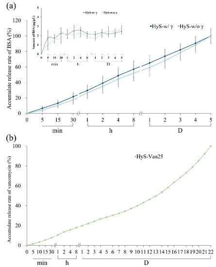 Protein release of BSA before (HyS-w/o γ) and after (HyS-w/γ) sterilization of hydrogel macrospheres in vitro (n = 10) (a) and cumulative antibiotic release of hydrogel macrospheres impregnated with vancomycin after sterilization (HyS-Van25, n = 10) (b).