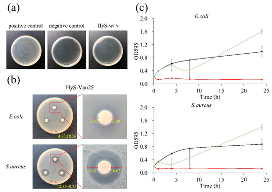 (a) Qualitative analysis of the sterility assurance of hydrogel macrospheres after sterilization (HyS-w/γ). (b) Qualitative results of the disk diffusion antibacterial effect of hydrogel macrospheres impregnated with vancomycin (HyS-Van25, n = 3) against E. coli and S. aureus after 24 h of interaction. Right figures indicate the inhibitory zones formed by the presence of macrospheres with a diameter of 6 mm. (c) Quantitative antibacterial results of hydrogel macrospheres impregnated with vancomycin after irradiation (HyS-Van25, n = 3) against E. coli and S. aureus after 24 h of interaction under broth dilution.