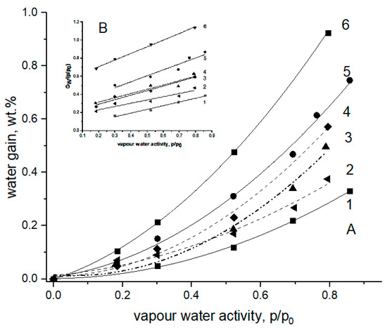 The isotherms of moisture absorption for pristine PHB and PLA fibers and their fibrillar blends at 25 °C [36]. (A) The PHB/PLA weight ratios: 1—100/0 (PHB), 2—70/30, 3—50/50, 4—30/70, 5—10/90, 6—0/100 (PLA). (B) Linearization of experimental data (points) by the polynomial equation—Equation (1).