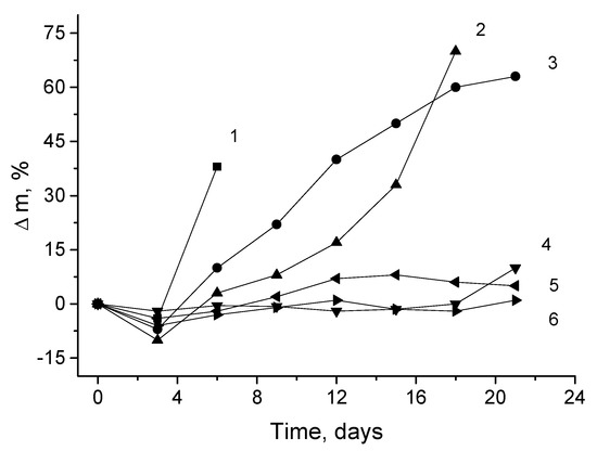 The study of hydrolytic degradation of the materials was carried out in a phosphate buffer that simulates the impact of the physiological environment. The materials were incubated in the phosphate buffer with a concentration of 0.025 M (pH = 7.4) at 70 °C for 21 days. The controlled weighing of materials was performed at regular intervals. The materials were extracted from the buffer solution, washed with distilled water, placed in an incubator for 3 h at 70 °C, and then weighed (the measurement error was 0.1 mg). In experiments with a phosphate buffer, the buffer was replaced every 3 days.