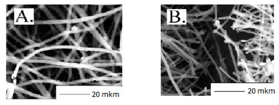 The average diameter of the fibers was determined by the SEM on the Hitachi TM-1000 (Tokyo, Japan). Direct measurement of the fiber geometric parameters was performed by the program Adobe Photoshop.CS3.Extended (Adobe, Inc., San Jose, CA, USA). The size distribution was based on the measurements of at least 300 fibers, and the average diameter was determined by the measurements of at least 100 fibers.