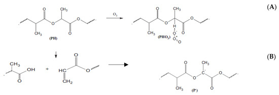 The scheme of polyester (PLA) ozonolysis. Two principal consecutive reactions of pendant groups’ formation (A) and the chemical rupture of the polymer chain (B)—advanced by [34].