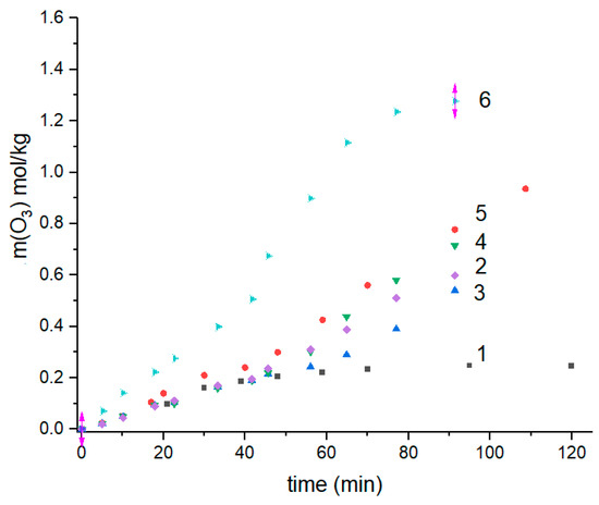 Ozone consumption by the ultrathin fibers at different wt.% of biopolymers PHB:PLA: 1—100:0; 2—0:100; 3—70:30; 4—30:70; 5—10:90; 6—50:50.