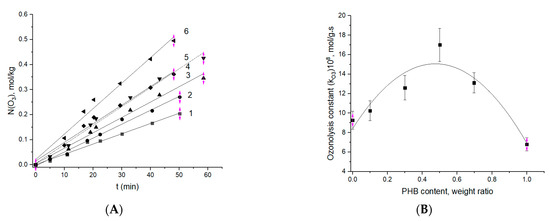 (A) Initial stage of ozonolysis for the fibers with different ratios—PHB:PLA (wt.%): 1—100:0; 2—0:100; 3—70:30; 4—30:70; 5—10:90; 6—50:50. (B) Effect of PHB content in the fibers on the effective constant ozonolysis.