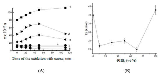 (A) The TEMPO correlation time (τ) for the PHB-PLA fibrous mats at different times of ozonation. Polymer ratio—PHB:PLA (wt.%): 1—100:0, 2—0:100, 3—70:30, 4—50:50, 5—30:70, 6—10:90. (B) The energy activation of TEMPO probe mobility in the fibrous blends of PHB and PLA.