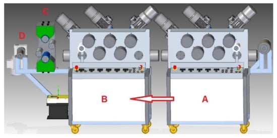 Diagram of the device for film orientation and activation by the corona discharge: A—heating module, B—cooling module, C—activator, D—film winding spool; arrow shows the direction of film transfer.