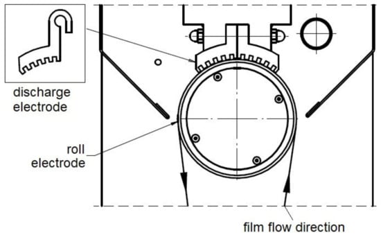 The electrode that has been used for corona discharge activation is made of an aluminum profile, of special multi-edged construction (Figure 2). It works together with the insulated supporting electrode (roller electrode). The distance between the activating electrode and the film does not exceed 1–2 mm, the average temperature is in the range of 30 to 35 °C. The unit housing is pre-insulated to avoid electromagnetic disturbance and electric shocks. The provided energy (E = 45 W·min/m2, i.e., 27 kWh/m2) has been calculated from the relationship: