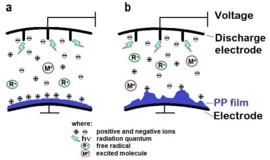 To avoid such a problem, in this work, i-PP samples were activated by a corona discharge, which is a subtle polarizing factor and acts only on a sample surface without disturbing the internal structure. This process consists of electrical discharges of relatively low power from special electrodes under atmospheric pressure in the presence of air. The energetic electrons, photons, excited atoms, and molecules as well as generated ions create the non-thermal plasma that extends only in a small area around the electrode (much smaller space than the gap between the electrodes). These active individuals are carried in an electric field, reach a sample surface and interact with polymer molecules. The surface layer becomes modified, i.e., polar groups, crosslinks, and even electrets can be formed [16,17,18,19,20]. This method of modification is often used in industry to improve the adhesion of polymer films to other materials to facilitate printing, sticking, or laminating.