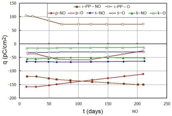 As a result of activation with the corona discharge, the samples of i-PP and its composites with 5% of the filler achieved the piezoelectric charge in the range from 10 to 150 pC/cm2. This charge was stable during the first few days in most samples and it was practically constant up to over 200 days of storage at room conditions (Figure 4).