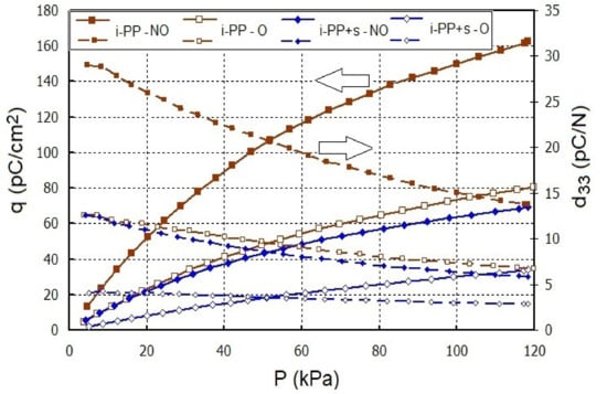 Figure 5 presents the dependences of |q| and d33 on stress (P) for the selected samples. The relations are non-linear; therefore, d33 values were determined at 100 kPa to compare the piezoelectric properties of the polymer sample with different filler. Moreover, the absolute value of the charge measured was used for the calculations of d33 values.