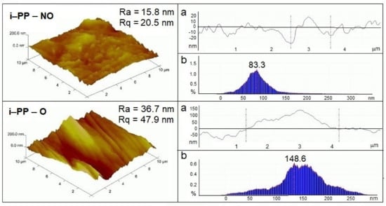 The highest value of piezoelectric coefficient d33, found for the unmodified and unoriented i-PP film, could be explained by the optimal surface roughness, which was lower than that for the composites containing fillers. Both the addition of the filler to i-PP and the orientation process led to a decrease in the values of the piezoelectric charge and d33, while the surface roughness increased. As can be seen, the neat i-PP film exhibited a smoother and flatter surface, where roughness parameters Ra and Rq were 15.8 nm and 20.5 nm, respectively (Figure 6). The orientation process caused an increase in the surface roughness for the unfilled i-PP film (Ra = 36.7 nm, Rq = 47.9 nm). In this case, the increase in the surface roughness was associated with the formation of folds due to the stretching of the film in one direction.