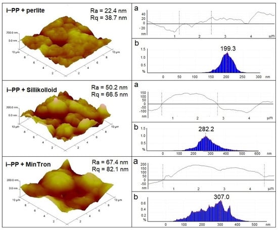 The relatively smooth surface of the i-PP film with perlite resulted from the morphology of this filler containing a lot of small, dusty fractions (90% particles had diameter lower than 0.1 μm [15] that accurately could fill the cavities formed during the extrusion process. In contrast, both Sillikolloid P87 [23] and MinTron 7 ™ [24] were composed of larger particles: only 50% < 1.5 μm and 50% < 5–9 μm, respectively. Moreover, perlite and MinTron 7™ were completely amorphous, in contrast to Sillikolloid P87, which contained a crystalline phase, as previously confirmed with XRD [21].