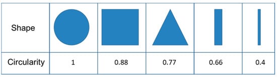 where A is the area and P the perimeter. Different shapes and corresponding circularity values can be seen in Figure 4.