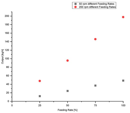The influence of feeding rate on the output measured is illustrated in Figure 5. It can be seen that, at both screw speeds (50 rpm and 200 rpm), the output measured decreases with decreasing feeding rate. A 25% reduction in feeding rate results in a 25% reduction in output. The output at the feeding rate of 100% for 50 rpm was 48.7 kg/h and for 200 rpm was 197.6 kg/h.