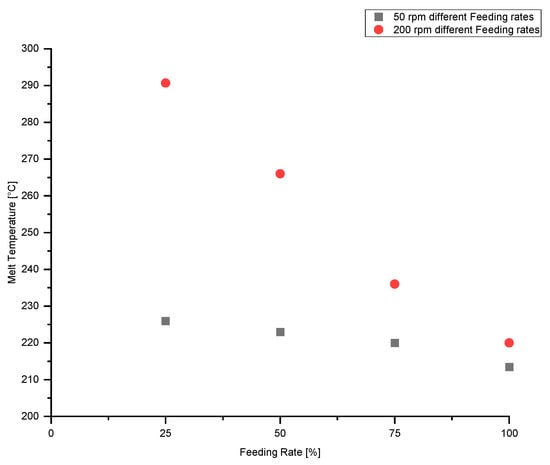 Influence of feeding rate on melt temperature at screw speeds of 50 rpm and 200 rpm.